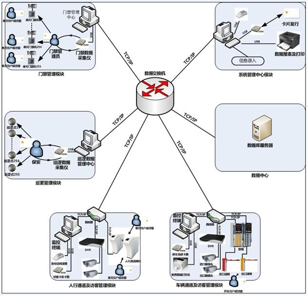 住宅小区外围安全防护第一线的人行通道管理子系统及车辆出入管理子系统采用TCP/IP通讯方式。依托小区内部局域网将底层的硬件设备(人行通道闸、车道出入口控制器机)与物业中心服务器端、物管中心前台发卡工作站、保安值班室客户端以及车道收费岗亭的客户端联接。